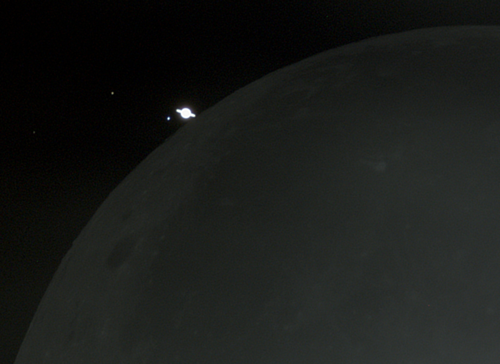 Saturn-Måne passage – 20250104 2025-01-042025-09-18 pdj Saturns passage bag Månen Saturn går ind bag Månen på dens mørke side, hvor Saturns klart overstråler Månen, men Saturn går ud igen ved Månens lyse side, der er så kraftig at Saturns overstråles. Saturn på vej ind bag Månen. Saturn på vej væk fra Månen.