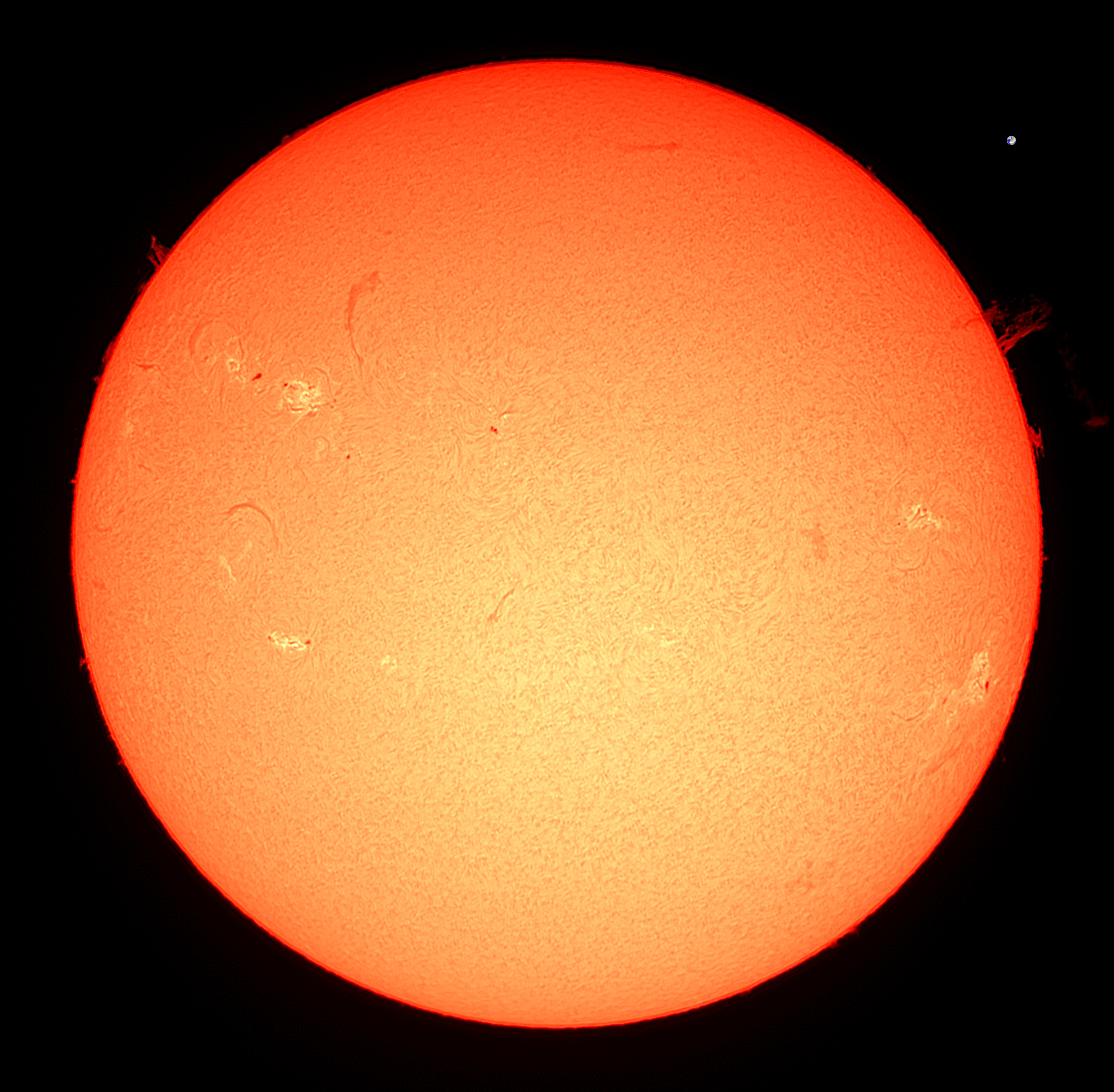 Solen – 20250614 2025-06-142025-09-18 pdj Et billede af Solen gennem solkikkerten. Jeg har lagt et billede af Jorden ind i rette størrelsesorden. Ja, det er den lille klat oppe til højre…